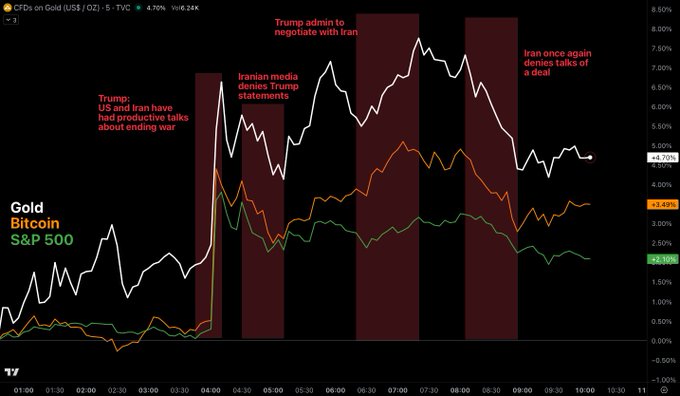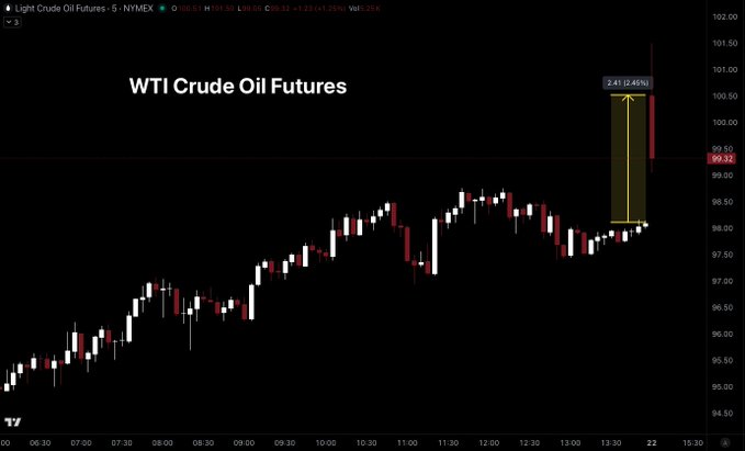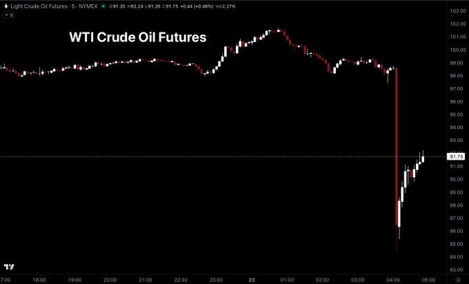 트럼프가 Truth Social에 이란 석유 인프라에 대한 이전 위협을 연기할 의향이 있다고 게시하자 원유 가격이 완전히 폭락했습니다. twitter.com/milocredit/status/...