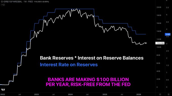 은행들이 안정적인 수익률에 반대하는 진짜 이유 현재 금리 수준에서 대형 은행들은 (연준에 준비금을 예치하는 것만으로) 매년 1,100억 달러를 완전히 위험 부담 없이 벌어들이고 있습니다. 1,100억 달러, 매년 말입니다.