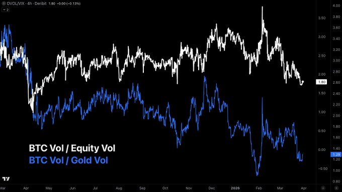 비트코인은 금과 주식을 능가했을 뿐만 아니라... 비트코인의 변동성은 금과 주식 변동성에 비해 현저히 낮으며, 지난 해방 기념일과 같은 지정학적 사건 당시보다 훨씬 낮습니다. 이러한 커버드 콜 전략들이 변동성을 억제하고 있습니다(언젠가는 그럴 것입니다). twitter.com/milocredit/status/...
