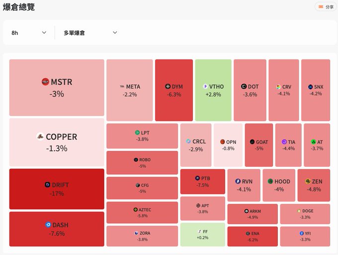주요 업체들이 시장을 꽉 움켜쥐고 있죠... 다시 공매도를 하려고 하면 바로 가격을 다시 끌어올리네요, 헤헤 😶🌫️ 지난 8시간 동안 대량 장기 포지션이 청산된 토큰은 다음과 같습니다: $MSTR $COPPER $DRIFT $DASH... twitter.com/__Blave__/status/2...