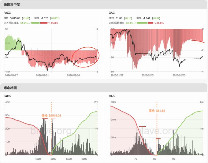 금과 은은 지난주에 이어 반등세를 이어갔지만, 추가 상승 여력이 있을까요? 🤔 데이터 관점에서 보면... 금 가격이 5,000에서 4,700 사이에서 등락을 반복하고 있으며, 공매도(Short) 코인 축소 조짐을 보이고 있습니다. 이는 매수세에 긍정적인 신호로, 고래 거래자 서서히 롱 포지션으로 이동하고 있음을 시사합니다. 청산 맵을 보면 숏 포지션 청산량이 가장 많았던 곳은 5,150이었고, 하락세에서는 4,820 아래에 집중된 것으로 나타났습니다. 은은 코인 측면에서 금보다 상대적으로 약세를 보이며 단기적으로 소폭 하락 추세를 나타내고 있습니다. 마진콜 맵을 보면 개별 롱 포지션 거래량이 상대적으로 많으며, 마진콜 발생 건수는 90위안과 74위안 부근에 집중되어 있습니다. twitter.com/__Blave__/status/2...