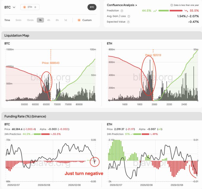 $BTC 및 $ETH 청산 지도 모두 하락 추세에서 잠재적으로 큰 청산 클러스터가 나타나는 것을 보여주며, 이는 비트코인(BTC) 의 경우 약 67,500, 이더리움(ETH) 의 경우 약 1,970 부근에 집중되어 있습니다. 동시에 비트코인(BTC) 펀딩 비율이 이미 마이너스로 전환되었는데, 반전 전에 마지막으로 롱 포지션이 대량으로 매진될 가능성이 있을까요? 🤔 주의 깊게 지켜볼 만합니다!