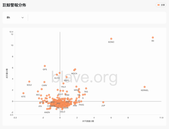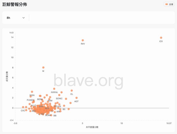 지난 8시간 동안의 고래 알림에서 "고래 진입 영역" 오른쪽 상단에 $ICX $RVV $M와 같은 숫자가 나타나는 것을 확인할 수 있습니다. 이는 해당 암호화폐에서 상당한 고래 활동이 발생했으며, 매우 높은 미결제약정(OI)과 증가된 거래량을 동반하고 있음을 나타냅니다.