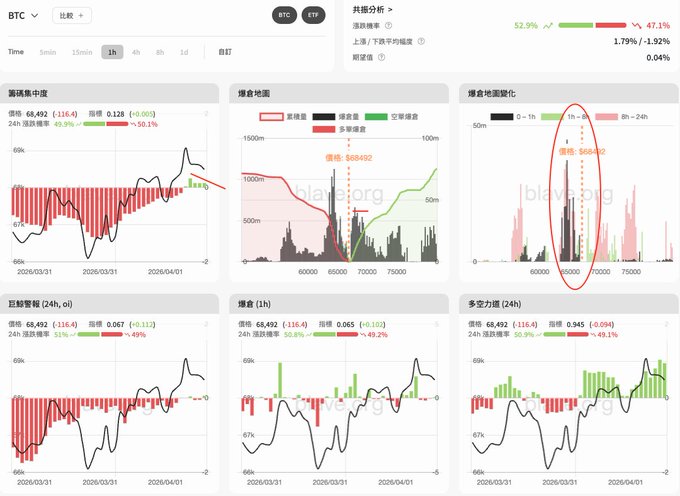 어젯밤부터 공매도(Short) 코인 집중도가 꾸준히 감소하고 있으며, 고래 투자자들의 움직임과 맞물려 고래들이 숏 포지션을 청산하려는 움직임을 보이고 있습니다. 공매도(Short) 커버링으로 촉발된 숏 커버링 열풍이 계속되고 있습니다... 🥸 실제 거래자 들의 마진콜 지도를 보면 68,300에서 69,000 사이의 선이 나타나는데, 이는 청산될 수 있는 공매도 포지션이 대량 의미하므로 주의해야 합니다!