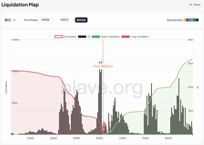 네, 특히 $BTC 실제 거래자 유동성 지도에서 66k~65k까지 이어지는 길고 큰 클러스터가 존재합니다.