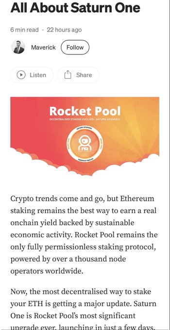 며칠 후 출시될 @Rocket_Pool Saturn 업그레이드에 대해 궁금한 점이 있으신가요? 이 글에서 필요한 모든 정보를 확인하실 수 있습니다. 아래 트윗을 확인하세요 👇👇