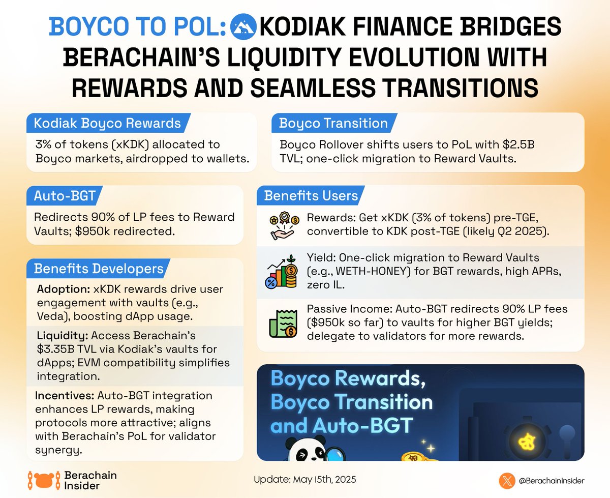 🌊 @KodiakFi와 함께하는 흥미진진한 시간이 다가옵니다! 보이코에서 PoL로의 전환으로 @Berachain에서 3.35억 달러의 Total Value Locked(TVL)와 보상 금고로의 원클릭 마이그레이션을 제공합니다! 🎉 xKDK 보상, 높은 연간 수익률, 그리고 Auto-BGT를 통한 수동 수입을 즐기세요. 개발자들, #Berachain의 디앱(DApp)을 강화하세요.