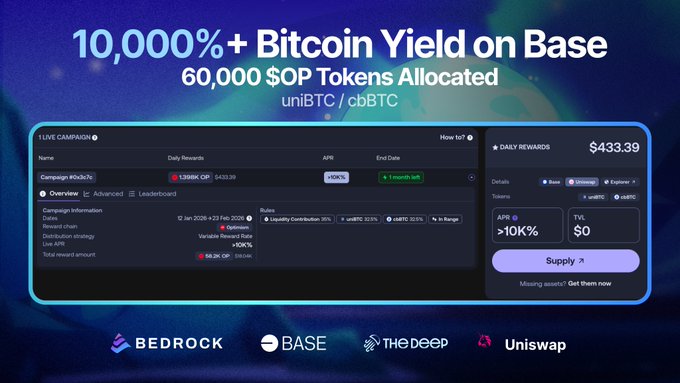 @base에서 비트코인에 엄청난 터보를 장착했습니다 🔵 여러분의 비트코인(BTC) 그냥 놀려두지 마세요. @groweniswap에서 제공하는 60,000 BTC의 인센티브로 더욱 활성화시켜 드립니다. 🏎️ 알파 과정: 1월 12일 – 2월 23일 • 풀: $uniBTC / $cbBTC (유니스왑(Uniswap) 에서) • 제작: @TheDeep_xyz & @Bedrock_DeFi • 보상: 60K $OP (via @merkl_xyz) • 수익률: 연이율 10,000% 이상 및 일일 리워드 433달러 이상 터보가 작동하기 시작했습니다. 출발선에서 뒤처지지 마세요. 액셀을 밟으세요: 👇 app.merkl.xyz/opportunities/ba...…