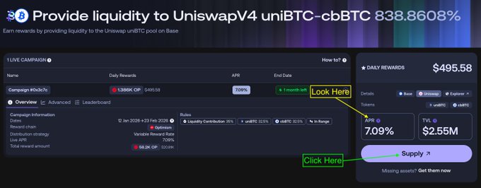 솔직히 말해 보세요. @base에 올려둔 비트코인이 실제로 제값을 하고 있나요? 만약 $uniBTC / $cbBTC 풀에 참여하지 않았다면, 수익을 놓치고 있는 겁니다. 🗓️ 1월 12일 ~ 2월 23일 (6주) 🔵 연이율 7.09% 🔵 일일 보상 $495.58 ⬇️ 직접 확인해 보세요: app.merkl.xyz/opportunities/ba...…