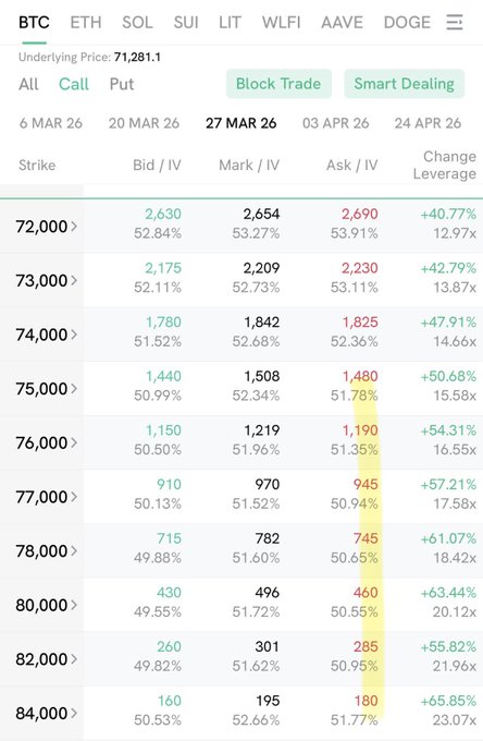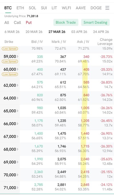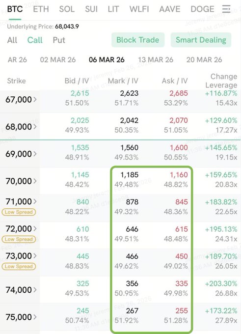 👉 71k 콜옵션(3월 6일) 매수는 비트코인(BTC) 3월 6일 이전에 71,000달러를 돌파할 수 있다는 전망을 나타냅니다.