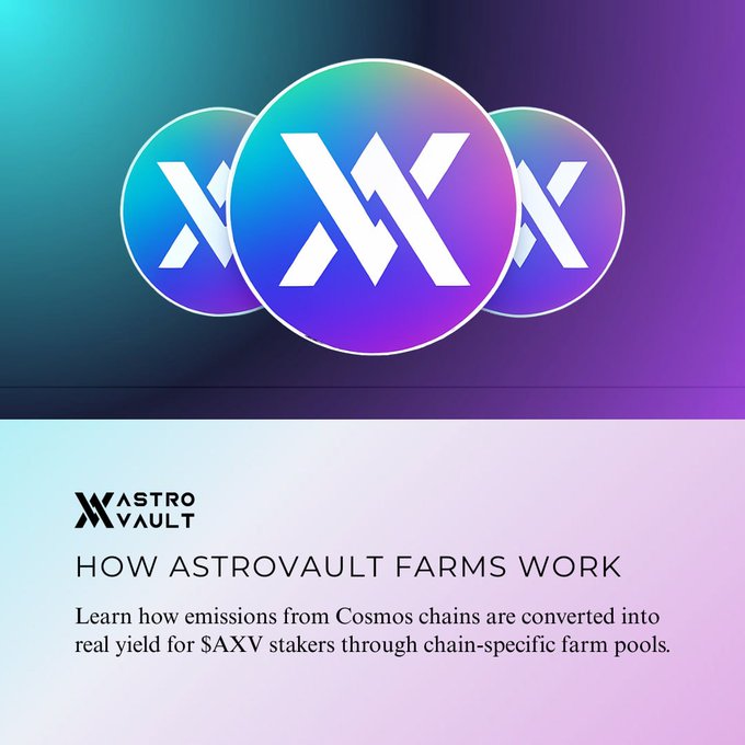 1/3 Astrovault Farms를 통해 사용자는 코스모스(Cosmos) 체인에 연결된 특정 Farm(@ArchwayHQ, @Neutron_org, @NibiruChain)에 $AXV 예치(stake) 할 수 있습니다. 이 농장들은 $AXV 배출량과 생태계 활동으로 조성된 기금으로 보상을 지급합니다.