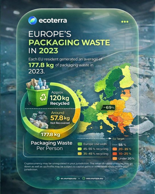 유럽에서는 매년 1인당 177.8kg의 포장 폐기물이 발생합니다. 이 중 약 120kg이 재활용되고, 거의 58kg은 여전히 재활용되지 않고 있습니다. 격차의 핵심은 인센티브, 추적 가능성, 그리고 참여에 있습니다. 에코테라는 일상적인 행동을 실질적인 가치와 연결합니다.