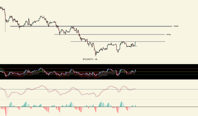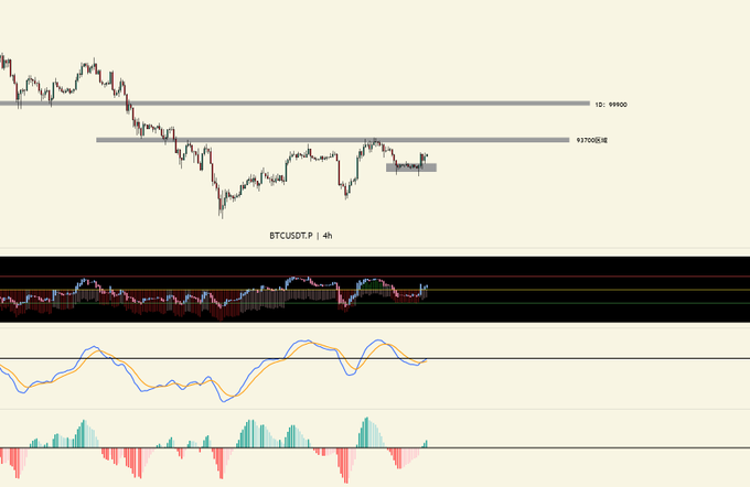 현재는 4H 기준 93,700 구간까지 상승을 먼저 보고 있습니다. 이후 추가 돌파가 나온다면 일봉 기준 반등 흐름으로 99,900까지 상승도 기대해볼 만해요. 다만, 일봉 반등 저항도 염두에 둘 필요 있습니다.