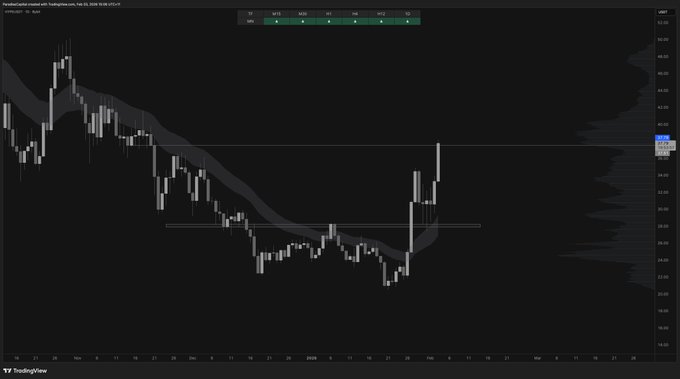 $HYPE 일일 추세 재시험 후 지지선에서 상승하여 다음 고가 지지선인 37.50달러까지 상승했습니다(3일 공급 + 고가 지지/저항). 깔끔한 움직임입니다. 현재 대부분의 알트코인은 일봉 추세선 아래에서 서서히 하락세를 보이고 있습니다. HYPE는 전체 시장이 폭락하는 동안 횡보세를 보이다가 비트코인(BTC) 반등 조짐을 보이자마자 강하게 반등했습니다. 마치 물속에 빠진 비치볼처럼 말이죠. 이런 덤프에서 상대적인 강도를 항상 주의 깊게 살펴볼 필요가 있습니다. 가장 강하게 반등하는 덤프가 항상 강한 것은 아닙니다. 반등에는 여러 요인이 작용할 수 있습니다. 오히려 다른 모든 덤프와 달리 잘 무너지지 않는 덤프가 강한 경우가 많습니다 (Canton $CC이 그 예입니다). 그게 바로 단서야.