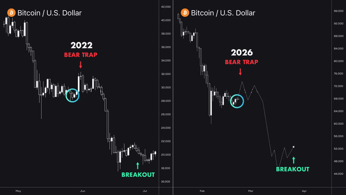 비트코인이 이번 사이클의 마지막 베어 트랩에 진입했습니다. 이 차트는 지금까지 틀린 적이 없으며 2022년 패턴을 그대로 반영하여 3~5일 내에 $BTC 저점을 가리키고 있습니다. 당시 많은 베어 투자자들이 돌파 사이클 동안 매수하려다 저점을 놓쳤습니다. 무시하셔도 되지만, 제가 경고했다는 사실을 잊지 마세요! twitter.com/Danny_Crypton/stat...