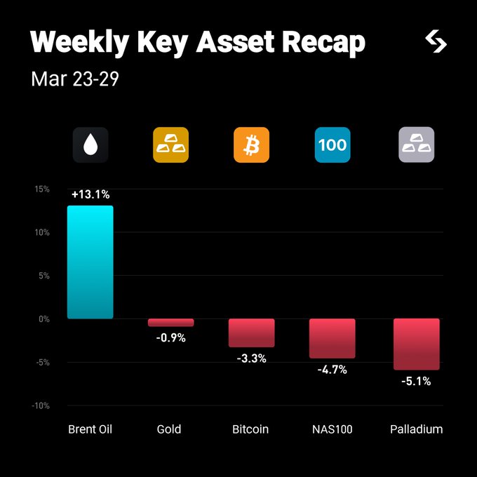 브렌트유 가격이 지난주 상승했습니다. 비트코인(BTC), 금, 나스100, 팔라듐 가격이 하락했습니다. 이것은 무슨 뜻인가요?