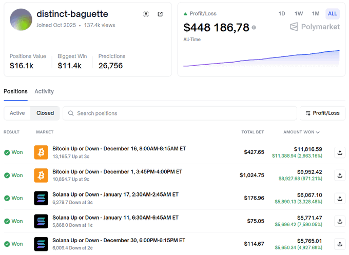 저는 3일 동안 이 지갑 덕분에 폴리마켓(Polymarket)을 이해하게 되었습니다. 단 26,756건의 거래로 448,186달러의 수익을 올렸습니다. 이 전략은 고정된 1달러 정산 방식의 바이너리 옵션 거래만 합니다. 전략은 매우 간단하고 확장성이 뛰어납니다. 작동 방식은 다음과 같습니다. 1단계: 가격 변동성 또는 공황으로 인한 가격 재조정을 기다립니다. 2단계: 합산 가격이 1달러 아래로 떨어지면 YES와 NO를 매수합니다. 3단계: 안정적인 포지션 규모를 유지합니다. 4단계: 정산될 때까지 양쪽 포지션을 모두 보유합니다. 5단계: 이 과정을 계속 반복합니다. 처음에는 모든 것이 이상하게 느껴졌지만, 직접 해보니 돈을 찍어내는 기계라는 것을 확실히 알 수 있었습니다. 프로필: polymarket.com@distinct-baguette…