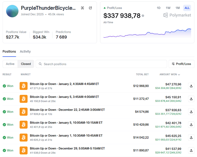 비정상적인 손익 곡선을 발견한 후 폴리마켓 지갑을 추적해 보았습니다. 처음 투자한 2,000달러가 한 달도 채 안 되어 337,938달러로 불어났습니다. 이 지갑은 숏 암호화폐 거래만 지원합니다. (예/아니오) 대부분의 거래량 $BTC 15m 창문에 집중되어 있습니다. 헤징 없이 한 방향으로 포지션을 개설합니다. 이 설정이 작동하는 방식은 다음과 같습니다. 1단계: 바이낸스에서 실시간으로 현물 가격을 모니터링합니다. 2단계: 확실한 모멘텀 움직임을 기다립니다. 3단계: 배당률 조정 전 폴리마켓을 확인합니다. 4단계: 가격 결정 지연 시간 동안 진입 5단계: 해결될 때까지 유지하고 반복합니다. 현물 시장 가격과 폴리마켓 가격 업데이트 사이에 시차가 있습니다. 이러한 지연은 지속적인 가격 불균형을 초래합니다. YES 계약은 공정 가치보다 훨씬 낮은 가격에 누적되어 있습니다. 마감 직전에 거의 0에 가까운 가격으로 계약이 체결되는 경우는 없습니다. 한 건의 이더리움(ETH) 거래에서 15분도 안 되어 785%의 수익률이 발생했습니다. 평균 포지션 크기 는 약 7,000달러입니다. 해당 지갑은 하루에 수십 건의 거래를 실행합니다. 총 거래량 거래량 6,900만 달러를 넘어섰습니다. 손실은 드물고 규모도 작습니다. 기회는 아직 남아 있습니다. 프로필: polymarket.com@PurpleThunderBicycleMountain…