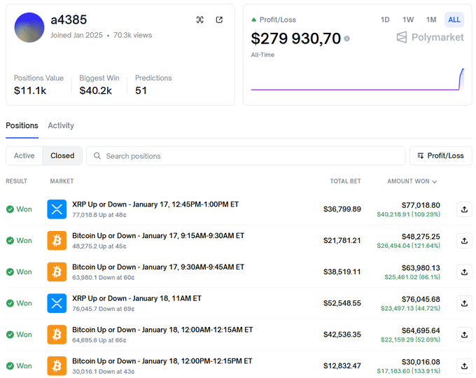 저는 어젯밤 Polymarket 지갑 하나를 추적했습니다. 15분 시장에서 거래하여 279,930달러를 벌었습니다. 여러 코인의 가격 방향을 거래합니다. 설정은 매우 간단합니다. 전략은 다음과 같습니다. 1단계: 유동성이 부족한 시간대에만 거래합니다. 2단계: YES 코인을 적극적으로 매수하여 시장 확률을 높입니다. 3단계: 봇을 사용하여 가격이 과도하게 상승했을 때 자동으로 매도합니다. 4단계: 유리한 평균 매입 단가에서 매수량을 늘립니다. 5단계: 결제 직전에 현물 가격을 살짝 조정합니다. 이 사람은 자신이 무엇을 하고 있는지 정확히 알고 있습니다. 프로필: polymarket.com@a4385