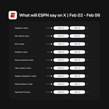 🏈 ESPN 슈퍼볼 주간 특집 슈퍼볼 LIX가 일요일에 열립니다. 이번 주 ESPN 방송에서 "슈퍼볼", "패트리어츠", "시애틀 시호크스"를 몇 번이나 언급할까요? 지금 예측해 보세요 ⏬ 새로운 시장: ESPN은 방송에서 무엇을 말할까요? | 2월 2일 - 2월 6일
