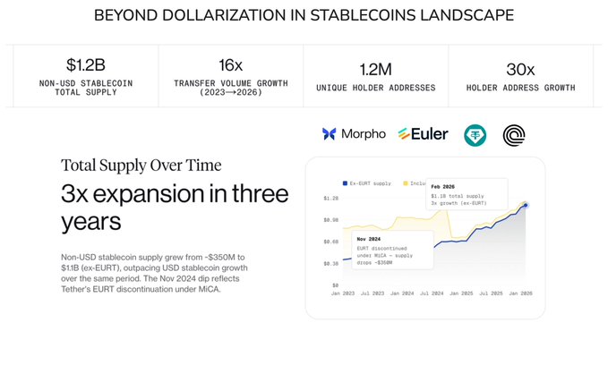 약 12억 달러 규모의 비달러 스테이블코인과 약 3천억 달러 규모의 달러 스테이블코인을 비교해 보니 암호화폐 유동성이 사실상 달러화되어 있다는 것을 깨달았습니다. 처음에는 스테이블코인 지배력이 단순히 규모의 문제라고 생각했습니다. 예를 들어 USD가 먼저 시장에 진입했고, 유동성이 축적되면서 다른 코인들도 나중에 따라잡을 거라고 생각했죠. 하지만 실제 흐름이 어떻게 작동하는지 자세히 살펴보니 그렇게 간단하지 않다는 것을 알게 되었습니다. 제가 생각하는 방식을 설명해 드리겠습니다. 1/ 데이터는 작아 보이지만 신호는 강하다 - 총 스테이블코인: 약 3,150억 달러, 비달러화폐: 약 12억 달러(약 0.4%). - 이체 건수 증가율: 2023년 이후 +16배, 사용자 수: +30배. 네, 규모는 작지만 보급률은 그렇지 않습니다. 2/ 유동성은 사용량에 관한 것입니다 - 비달러화 자금 흐름의 약 80%는 지급, 급여, 결제입니다. - 대출 비중은 약 29%, 탈 탈중앙화 거래소(DEX) 약 17%, 중앙화 거래소 (중앙화 거래소(CEX) 약 14%에 불과합니다. USD 스테이블과 비교해 보니, 디파이와 담보를 활용한 레버리지 등 금융화가 매우 심화되어 있다는 것을 깨달았습니다. 솔직히 말씀드리면, 대부분의 달러 유동성은 여전히 시스템 내에 머물러 있고, 달러 이외의 통화 유동성은 이미 실물 시장에 유통되고 있습니다. 3/ 모든 스테이블코인의 유동성이 동일한 것은 아닙니다. 완전히 다른 두 가지 유동성 시스템이 형성되고 있습니다. (1) USD 유동성 - 글로벌, 금융화. DeFi, RWA, 담보, 국채 발행에 기반하여 지배적인 위치를 차지하고 있으며, 전통적인 금융(TradFi)과 밀접하게 연관되어 있습니다. 매우 효율적이지만, 몇몇 발행기관에 집중되어 있습니다. 이곳은 테더(Tether) | $USDT와 서클(Circle) | $USDC 같은 플레이어들이 게임을 완전히 장악하는 곳입니다. (2) 현지 통화 유동성 - 지역적, 거래적 이는 결제, 외환, 정산에 사용되며 현지 시스템에 연결되어 있어 유동성은 다소 떨어지지만 경제적으로는 더 실질적입니다. 제가 보고 있는 참고 자료 몇 가지: - $EUR → 아베(AAVE), Morpho 내에서 DeFi 대출을 지배합니다. - $BRL → PIX와 통합되었습니다. - $SGD / $JPY → 아시아의 국경을 넘는 정착. 이는 암호화폐 시장이나 달러화 현상과는 별개로, 금융이 암호화폐 영역에 진입하는 것을 의미합니다. 제가 지금 주목하고 있는 주요 프로토콜: → @SkyEcosystem | $SKY - USDS와 다이(Dai) 합산 약 130억~160억 달러 (USDS 약 80억~110억 달러 + 다이(Dai) 약 45억 달러). 최종 단계 출시에서는 RWA 통합에 중점을 둡니다. → @ethena | $ENA - USDe는 약 59억 달러입니다. "현금 거래" 수익률을 위해 DeFi와 통합됩니다. → @PayPal - 연간 매출액 약 40억 달러, 기업 결제에 집중. → @fraxfinance - 프랙스(Frax)/USDF, 알고리즘/하이브리드 모델. → 화이트 라벨 인프라: Bridge(Stripe), @brale_xyz, @m0, @Paxos - 기업이 맞춤형 스테이블을 신속하게 출시할 수 있도록 지원합니다. 4/ 유동성 인프라가 실제로 확보되는 곳 중요한 요소는 세 가지입니다. → 발행량은 여전히 테더 USDT(USDT) /USDC가 주도하고 있지만, 지역적으로는 현지 발행사가 우위를 점할 것입니다(규제 및 은행 접근성). → 아베(AAVE), Morpho 이더리움 클래식(ETC) 의 머니마켓에서 유동성이 고갈됩니다. 예금을 확보하는 쪽이 유휴 유동성을 통제하게 됩니다. → 실제 거래량 발생하는 결제 및 정산 시스템, 통합 > 인센티브 5/ 제가 얻은 결론 USD 스테이블코인이 1단계에서 승리했습니다 → 가치 저장 수단 이자 DeFi 담보 자산입니다. 비달러 스테이블코인은 2단계, 즉 실물 결제 및 현지 결제에 활용되고 있습니다. 이런 상황이 지속되면 유동성은 통화, 지역, 철도망 등 다양한 경로로 분산될 것입니다. 저는 우리가 하나의 글로벌 유동성 풀에서 온체인으로 연결된 여러 지역 유동성 영역으로 이동하고 있다고 생각합니다. 솔직히 말해서, 그런 시스템을 구축하는 건 훨씬 더 어렵지만, 실제 경제가 작동하는 방식에 훨씬 더 가깝습니다. 스스로 조사하세요.