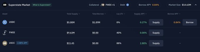 @SuperstateInc의 Jim에게 이 파트너십이 실제로 무엇을 의미하는지 물어봤습니다. 그는 모두가 국채에 너무 많은 돈을 쏟아붓고 있고, 투자자들이 이제 더 높은 수익률을 노리고 있다고 설명했습니다. "만약 10억 달러 규모의 포트폴리오를 운용하는데 당장 모든 자산을 유동화할 필요가 없다면, 분기별 유동성을 확보하면서 3.5%의 수익률을 내는 국채 대신 6%의 수익률을 내면서 3.5%의 수익을 내는 게 낫지 않을까요?" twitter.com/robbiek__/status/2...