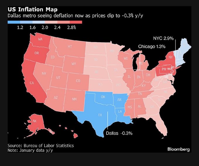 상위 12개 대도시의 평균 소비자 가격 지수(CPI) 2.2%에 불과했습니다. 남부의 댈러스와 같은 일부 주요 도시에서는 디플레이션이 발생했습니다. 출처: @atanzi @더터미널 blinks.bloomberg.com/news/stor...…