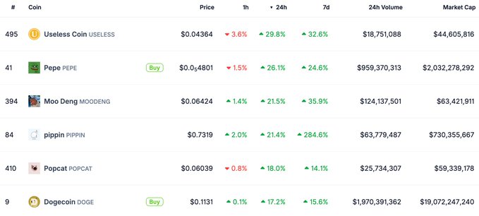 $USELESS와 $PEPE는 올해 초 밈코인(memecoin)이 급등했을 때 가장 빠른 속도를 보였던 코인들이었습니다. 이 코인들은 6만 달러($BTC) 바닥 이후 알트코인 시장에서 처음으로 나타나는 본격적인 움직임 속에서 다시 한번 가장 강하게 반등하고 있습니다. 역사는 항상 반복되는 것은 아니지만, 비슷한 양상을 보인다는 말이 있죠. 어쨌든, 쓸모없는 코인에 관해서 말하자면, 현명한 사람이 제게 이런 말을 했습니다. "가장 빠른 말을 놓치지 마라…"