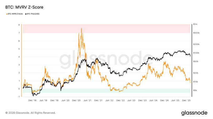 MVRV Z-점수가 2022년 10월 이후 최저 수준으로 떨어졌습니다. 당시 가격은 29,000달러 부근에서 거래되었습니다. 이는 미실현 수익성의 확실한 재조정이며, 시장이 이전 확장 이후 적정 가치로 회귀하고 있음을 보여줍니다. MVRV Z-점수가 2022년 10월 이후 최저 수준으로 떨어졌습니다. 이는 미실현 수익성이 크게 개선되었음을 의미하며, 시장이 이전 확장 이후 적정 가치로 회귀하고 있음을 나타냅니다.