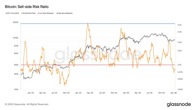 $BTC 매도측 위험비율이 2023년 10월 이후 최저 수준으로 떨어졌습니다. 이는 실현된 이익과 손실이 상대적으로 낮은 멀티플에서 발생하고 있음을 나타내며, 현재 가격 수준에서 매도에 대한 확신이 약화되었음을 시사합니다. glassno.de/3NgzZ0J