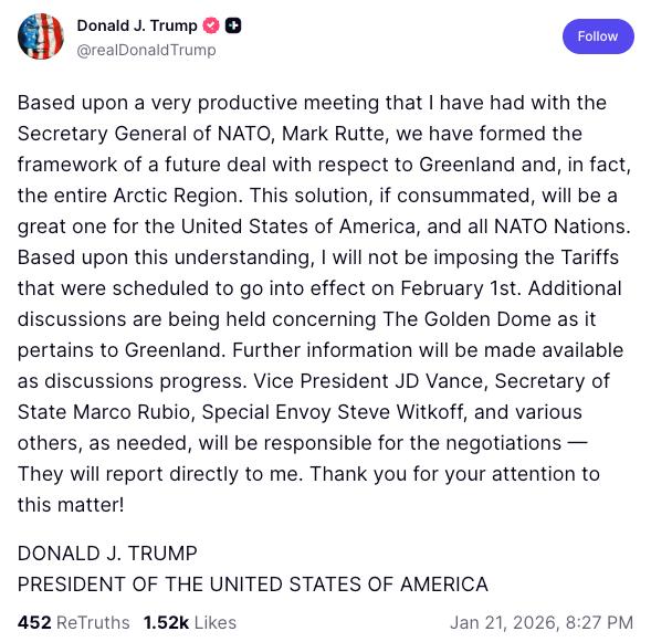 관세 공포는 이제 끝났네요 😅 "마크 뤼테 나토 사무총장과의 매우 생산적인 회담을 바탕으로, 그린란드, 나아가 북극 지역 전체에 대한 미래 합의의 틀을 마련했습니다. 이 해결책이 시행된다면 미국과 모든 나토 회원국에 이익이 될 것입니다." "이 합의에 따라 2월 1일부터 발효될 예정이었던 관세를 부과하지 않겠습니다." "그린란드와 관련하여 나토 사무총장실(골든돔)에 대한 추가 논의가 진행 중입니다." "협상이 진행됨에 따라 추가 정보를 공유하겠습니다." "존스 밴스 부통령, 마르코 루비오 국무장관, 스티브 위트코프 특사, 그리고 필요에 따라 다른 인사들이 협상을 담당할 것이며, 이들은 저에게 직접 보고할 것입니다. 경청해 주셔서 감사합니다." twitter.com/SwiatKrypto/status...