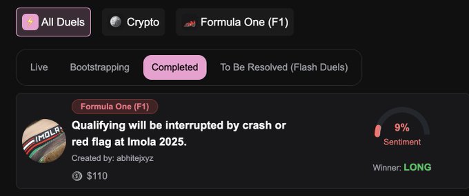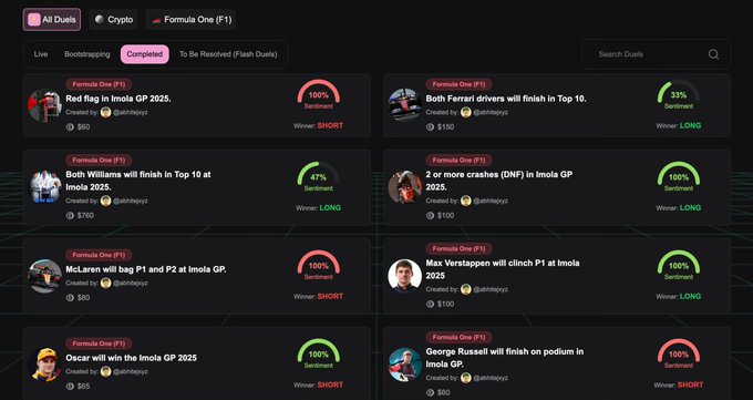 이몰라에서 정말 멋진 주말을 보냈습니다! > @MaxVertappen01이 65번째 그랑프리 우승을 차지했습니다. > @McLarenF1은 여전히 두 챔피언십 모두 선두를 달리고 있습니다. > @ScuderiaFerrari가 강력하게 복귀했습니다. > @WilliamsRacing은 계속해서 인상적인 모습을 보여주고 있습니다 (또한 가장 많이 거래되는 시장이기도 합니다). FlashDuels의 F1 시장은 더욱 발전할 것입니다.