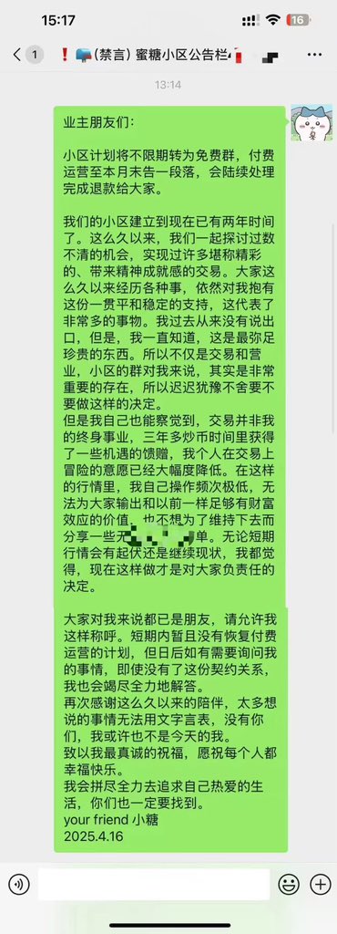 之前的付费群将转为免费的小群,并将多余的款项全部退还给大家。短期内没有恢复收费运营的计划。 由于我个人操作很少,也不玩合约,所以在这种行情下,没有足够优质的机会可以与大家分享。预计我会变得越来越佛系,偶尔冒泡和大家聊聊天。希望大家都能愉快幸福地生活。