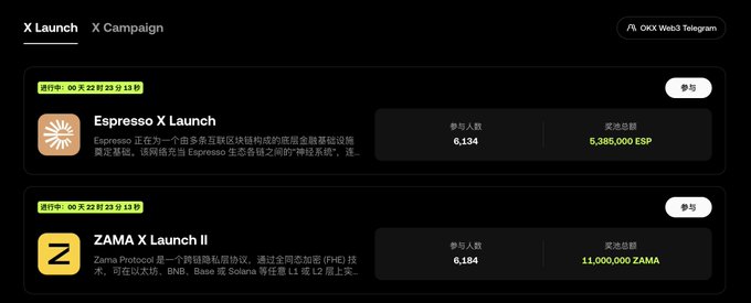 OKX 부스터 프로모션이 시작되었습니다! @wallet에서 총 두 가지 프로모션을 진행합니다: 1⃣에스프레소 @espressoFNDN ➡️5,385,000 ESP (30.8 wu 상당) ➡️1포인트 = 9 u 2⃣자마 @zama ➡️11,000,000 ZAMA (22.5 wu 상당) ➡️1포인트 = 6.8 u