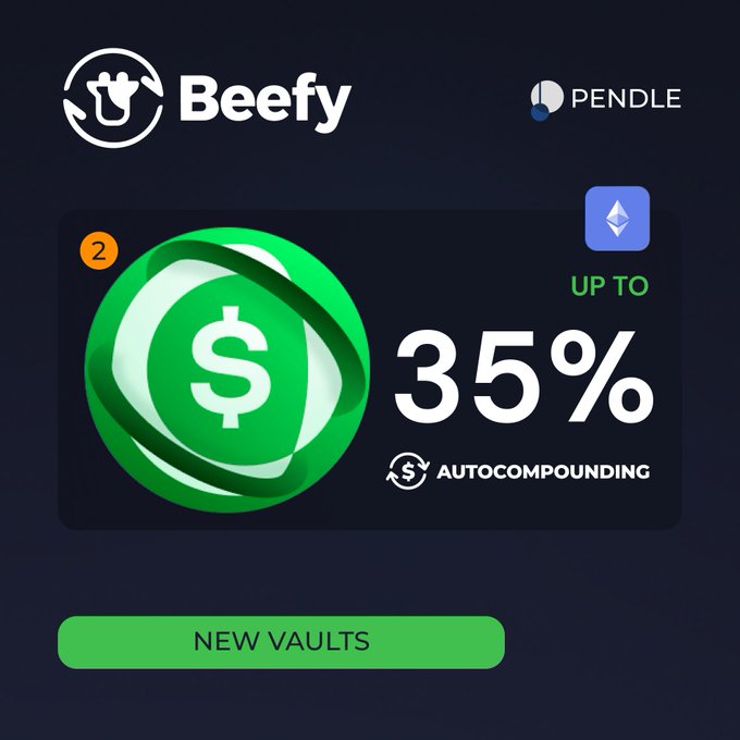 펜들(Pendle) 에 LPing이요? 좋아요. @Equilibriafi나 @Penpiexyz_io를 통해 수익률을 높이는 건 어떨까요? 더 재밌죠. 이제 Beefy가 모든 것을 자동 복리로 계산해서 연간 수익률 35%를 쌓는다고? 셰프의 키스. 11월 26일 USD0++ 풀이 방금 DeFi 전체 처리를 받았습니다 🐮 twitter.com/usualmoney/status/...