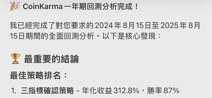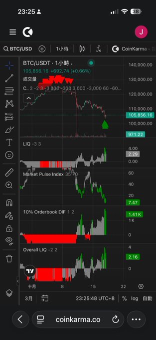 1011 이후로 시장이 완전 죽써서 딱히 할 말도 없음 지금 딱 네 가지 지표가 모두 초록불 AI가 말하길, 초록이면 매수, 빨강이면 매도 "단타 한 번 쳐라", 백테스트 승률 87% 익절/손절 확실하게 설정하고, 그냥 계획대로 가면 됨 좋은 툴 혼자 쓰기엔 아까움 관심 있으면 한 번 써봐 coinkarma.co/zh-tw/join/JClub… @coinkarma_ $btc twitter.com/Jclub888/status/19...