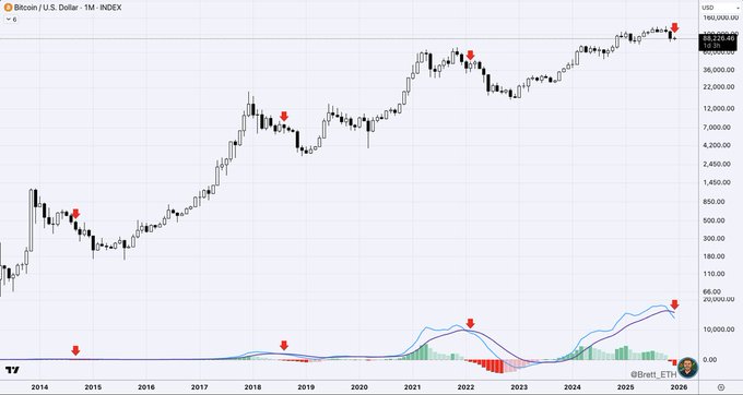비트코인의 월간 MACD 지표에서 2022년 2월 이후 처음으로 숏 신호가 나타났습니다. 이 지표는 이번 신호를 포함하여 지금까지 단 4개의 숏 신호만 출력했습니다.