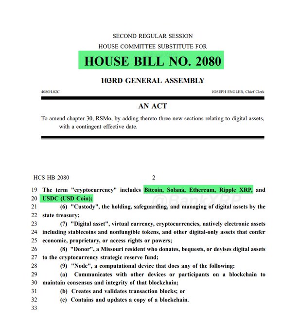 미주리주 암호화폐 전략 준비 기금(HCS HB 2080)이 위원회를 통과하여 2026년 3월 중순 현재 하원 본회의로 상정될 예정입니다. 아직 법안이 아닌 제안 단계입니다. 미주리 디지털 준비금 재무관은 다음을 수락, 보유 및 투자할 수 있습니다: $BTC $ETH $SOL $XRP $USDC 웹3 세금 납부 규제 대상 스테이블코인(예: USDC)으로 세금을 납부하세요. 재무 담당자는 비트코인(BTC)/ 이더리움(ETH)/ 솔라나(SOL)/ 리플(XRP) 로 교환할 수 있습니다. 5년 다이아몬드 핸즈(Diamond Hands): 매매/양도 전 최소 5년 이상 보유한 자산