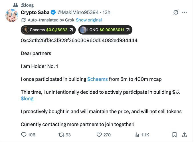BSC는 밈(meme) 모멘텀이 강세를 유지하며 🔥를 유지하고 있습니다! 새로운 토큰인 "Long 🐉"은 체인상에서 가장 많이 거래된 밈(meme) 으로 선두를 달리고 있으며, 상위 10명의 보유자가 공급량의 20% 이상을 통제하고 있습니다. 여기에는 공개적으로 매도하지 않겠다고 주장한 트레이더 Crypto Saba도 포함됩니다(👀).