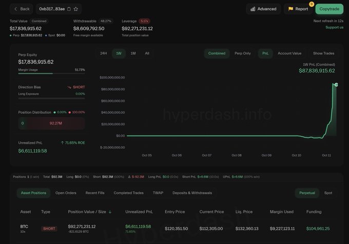 🚨 비트코인 OG가 12배 레버리지로 $BTC 및 $ETH 공매도로 1억 6천만 달러 이상을 벌었습니다. 어제 이 트레이더는 이더리움(ETH) 단기 포지션으로 3억 3천만 달러를 개시했고, 단 30시간 만에 비트코인(BTC) 와 이더리움(ETH) 숏 포지션의 대부분을 청산했습니다. 그 결과 무려 1억 6천만 달러 이상의 이익을 확보했습니다. # 이더리움(ETH) # 비트코인(BTC) # 크립토웨일즈