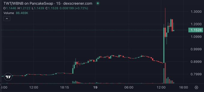 CZ가 새로운 Trust Wallet 라이트페이퍼에 올린 게시물에 힘입어 $TWT은 $1.26을 돌파한 후 $1.15 근처로 하락했습니다. 한 시간 만에 거의 +60% 상승했습니다. ⚡📈 사용 사례는 확장되고 있으며, 과대광고는 현실입니다… 하지만 변동성은 양날의 검입니다. — DYOR 🧠 twitter.com/1stepapp/status/19...