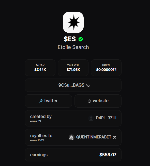 에투알 서치 | $ES 시가총액 7,500달러 모든 AI 에이전트에 메모리를 무료로 추가하세요. 그는 BagsApp 수수료를 일부 청구했는데, 코인이 잘 되면 참여할 수도 있겠네요. BagsApp 형제들, 이제 당신 차례입니다. 9CSuX6PLtaWBYT6TEEacEbbL7Udrt46fVv4XizhiBAGS twitter.com/DegenCapitalLLC/st...