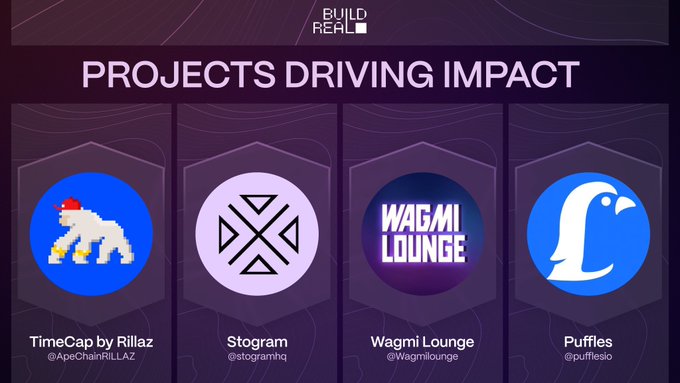 본주의 빌드 리얼 프로젝트에는 다음이 포함됩니다: <@ApeChainRILLAZ> <@StogramHQ> <@Wagmilounge> <@pufflesio> 이러한 암호화폐 분야에서 영향력 있는 프로젝트들은 우리의 주간 빌더 쇼 "데모 만들기"에서 50,000 스레브 포인트의 최고 상을 두고 경쟁할 것이며, 1명의 투표자는 10,000 스레브 포인트를 받게 될 것입니다.