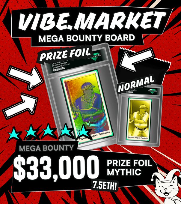 아직 아무도 이것을 끌어내지 않았기 때문에 우리는 메가 현상금 제안을 늘리고 확장하고 있습니다. 33,000달러 / 7.5 이더리움(ETH) 신화적인 상품인 호일 페페누스 바그너를 뽑으면 당신의 것입니다.