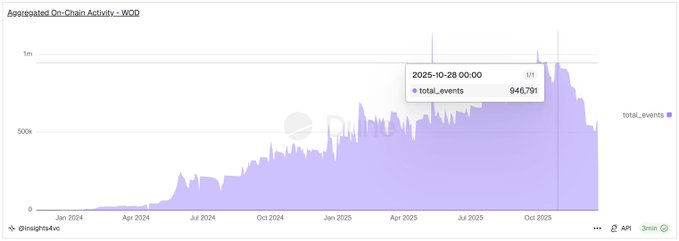 📊 @BNBCHAIN에서 강력한 상승세가 나타나고 있습니다! $WOD는 바이낸스 코인(BNB) Chain 및 opBNB 전반에 걸쳐 지속적인 참여와 함께 최고 100만 건에 가까운 이벤트를 기록하며 꾸준한 온체인 활동을 이어가고 있습니다. 대규모 게임이란 단순히 거래량 만이 아니라, 실제 사용자들이 매일 상호작용하는 것을 의미합니다. 아래 데이터를 살펴보세요 👇 http:/dune.com/insights4vc/wor...… twitter.com/worldofdypians/sta...