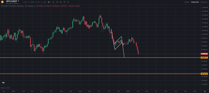 $BTC 🧵 추세가 매우 강해 보입니다(극도로 약세). 가격이 볼린저점과 모든 이동평균선 아래에 있고, RSI/스토캐스틱RSI가 과매도 상태입니다. 반등 가능성은 있지만, 약 7만 달러 지지선을 무너뜨리면 더 큰 하락 가능성이 있습니다. 매수 포지션을 유지해야 합니다. 그렇지 않으면 추세가 무너질 수 있습니다. 👀