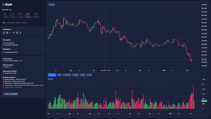 $ETH 완전 전부 매도(Capitulation) 모드 😱 추세 점수는 심각한 하락을 예고하고, ADX는 강한 추세를 확인시켜줍니다. RSI와 스토캐스틱 RSI는 과매도 상태이므로 반등 위험이 높습니다. 🛟 매수 포지션을 노리는 투자자에게 중요한 점: 1,800~1,850달러를 방어해야 합니다. 그렇지 않으면 새로운 저점까지 떨어질 수 있습니다. 위험 부담을 줄이고 매수 규모를 축소하세요.