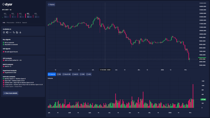 $BTC 잔혹한 하락 추세 😱 추세 지표는 전부 매도(Capitulation) 보내고 있습니다. 과매도 RSI/StochRSI는 반등 가능성을 시사하지만, 약 $69,000 볼린저점을 하회하면서 더 큰 폭의 하락으로 이어질 수 있습니다. 가격이 $75,000~80,000(EMA/슈퍼트렌드 영역)을 회복하기 전까지는 어떠한 상승세도 데드캣 리스크로 이어질 수 있습니다. 위험 관리에 유의하세요 🛡️