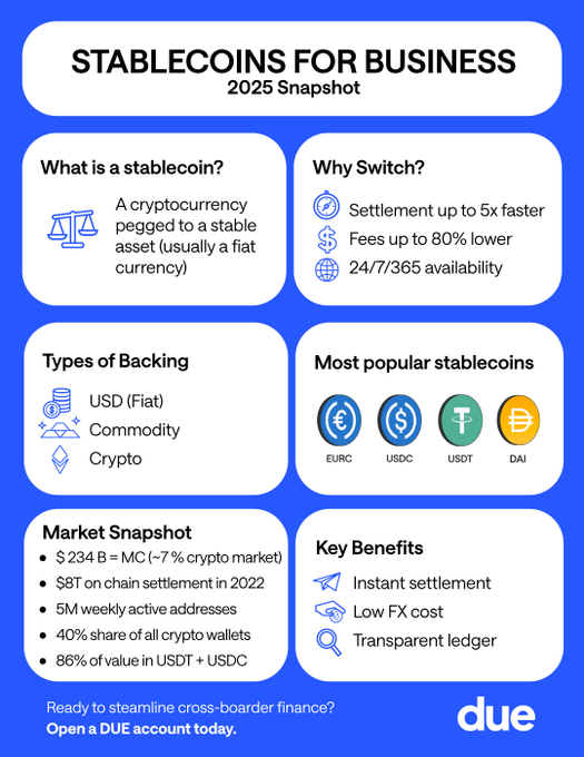 5배 더 빠른 정산, 수수료를 80% 절감하고, 24시간 365일 온체인 투명성으로 장부를 완벽하게 유지하세요 🔥. 느린 시스템과 숨겨진 비용에서 벗어날 준비가 되셨나요? 오늘 <Due> 계정을 개설하고 스테이블코인으로 비즈니스에 힘을 불어넣으세요: