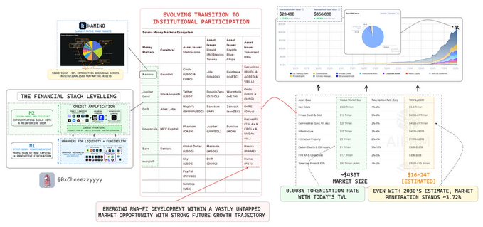 오늘날 끊임없이 진화하는 DeFi 환경에서 수평적인 생태계 간 분산은 가치 포착을 극대화하고 적응력을 유지하는 데 핵심적인 요소입니다. "사일로화된 VM만 사용하는" 시대는 끝났고, 단일 생태계에 집착하는 것은 시대에 뒤떨어진 생각입니다. 미래는 실행 계층 전반에 걸쳐 확장되는 네트워크의 시대이며, 한 계층에만 국한되는 네트워크의 시대는 아닙니다. 맨틀(Mantle) 이를 인지하고 빠르게 적응하고 있습니다. 맨틀(Mantle) 은 $MNT이 솔라나 기반 자산 가용성으로 첫 발을 내딛음으로써 유통을 경쟁 우위 요소로 삼는 명확한 장기 전략을 보여주고 있습니다. 개인적으로 이번 조치는 솔라나가 '인터넷 자본 시장' 플랫폼으로 발돋움하려는 더 큰 방향과 완벽하게 부합한다고 생각합니다. 특히 RWA-Fi가 시장에서 가장 신뢰할 만한 투자 전략 중 하나로 자리매김하고 있는 지금 더욱 그렇습니다. 어떻게 가능한지 궁금하시다면 잠시 멈춰서 더 큰 RWA 기회를 살펴보세요. @RWA_xyz에 맨틀(Mantle) , RWA 섹터는 약 235억 달러 규모의 Total Value Locked(TVL) (분산 자산)을 보유하고 있으며, 2023년 이후 14.7배 증가했고, 250개 이상의 활성 발행사에 힘입어 연평균 283.4%의 성장률을 기록했습니다. 하지만 이것은 아직 시작에 불과합니다. 🔸전 세계 실물 자산 가치는 약 430조 달러에 달합니다. 🔸2030년까지 토큰화된 자산 규모가 보수적인 추정치인 16조~24조 달러에 도달한다고 해도 전체 시장 규모(TAM)의 3.7% 침투율에 불과할 것입니다. 이 시장의 잠재적 상승 여력은 엄청나게 큽니다. 모든 체인점 중에서 솔라나(Solana) 기관 투자자 유치에 가장 적합한 환경을 갖춘 곳으로 두드러집니다. 우리는 이미 이러한 현상이 생태계 전반에서 나타나는 것을 목격하고 있습니다. 🔹@maplefinance를 통한 강력한 민간 신용 성장세 $syrupUSDC 심화 🔹@Securitize의 기관 발행 확대 ($ 비들(Buidl), $ACRED, $VBILL) 🔹@OndoFinance 자산($USDY, $OUSG)이 솔라나(Solana) DeFi 전반에서 활발하게 사용되고 있습니다. 🔹@BackedFi 토큰화된 주식이 Loopscale에서 인기를 얻고 있습니다 🔹Keel(스카이 프로토콜)이 25억 달러의 가용 자본 보유한 전용 유동성 배분 기관으로 참여합니다. 이러한 발전은 (1) 전략적인 토착 자본 존재와 (2) 토큰화된 금융에 대한 명시적인 제도적 검증을 모두 강조합니다. 맨틀의 최신 확장팩은 이러한 맥락에 거의 완벽하게 들어맞으며, 장기 로드맵의 방향성을 더욱 명확히 보여줍니다. 맨틀(Mantle) 4분기 이후 RWA(위험가중자산)에 더욱 집중해 왔으며, 최근의 시장 진출 전략은 최근 구축된 강력한 삼자 협력(Byreal, 바이비트(Bybit) , 맨틀(Mantle) )을 최대한 활용하여 토큰화된 자산을 위한 통합 발행 및 배포 프레임워크를 구현하고 있습니다. 이 구현에서 맨틀(Mantle) 과 Solana는 다음과 같습니다. 🔸 @byreal_io 님이 RWA 탈중앙화 거래소(DEX) 통합(유동성 공급자(LP) 레일)을 담당합니다. 🔸 @Bybit_Official은 바이비트(Bybit) Alpha 인터페이스를 통해 CeFi 배포를 담당합니다. 🔸 $MNT는 @LayerZero_Core OFT를 통해 안전하게 연결된 자산이 됩니다. 이러한 조합은 독보적으로 강력한 생태계 간 유통 고리를 만들어냅니다. Byreal의 로드맵이 이미 Solana 네이티브 DeFi 통합을 지향하고 있는 만큼, 맨틀(Mantle) 바로 적절한 시기에 기관에서 가장 검증된 생태계 중 하나에 진출할 수 있는 유리한 위치를 점하고 있습니다. 궁극적으로 저는 이것이 RWA-Fi의 제도적 중심축으로 빠르게 성장하고 있는 생태계에 진출하는 전략적 발판이 될 것이며, 비대칭적 상승 잠재력을 가진 장기적인 다중 생태계 입지를 구축하는 계기가 될 것이라고 생각합니다. 만약 이러한 추세가 계속된다면, 맨틀이 생태계 전반에 미치는 영향은 앞으로 더욱 커질 것입니다. twitter.com/0xCheeezzyyyy/stat...